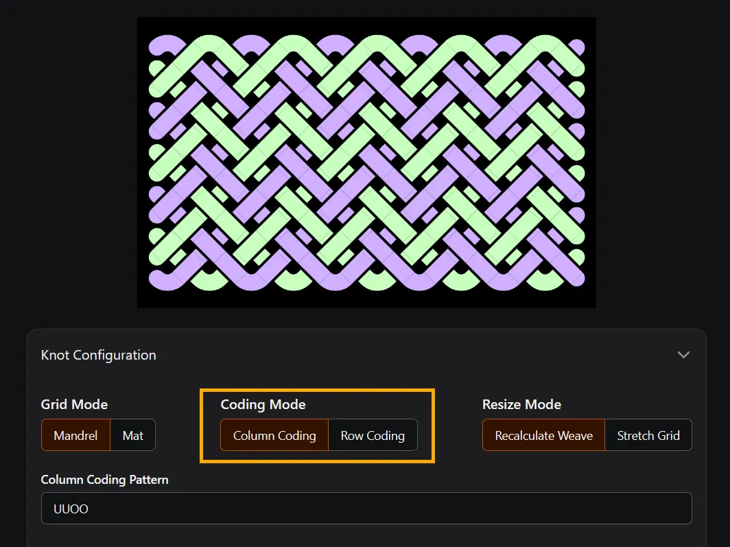 Coding Mode determines which axis the Coding Pattern is applied to - columns or rows. When looking at a crossing, the pattern determines if the \ strand is over or under.