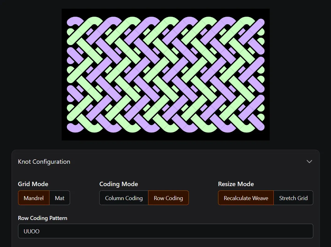 Section titled “Coding Pattern”Many knots use a simple repeating pattern - for example, a Turks Head uses OU Column Coding. You can use more complex repeating patterns or a fully coded pattern where each row or column is defined. To learn more see: