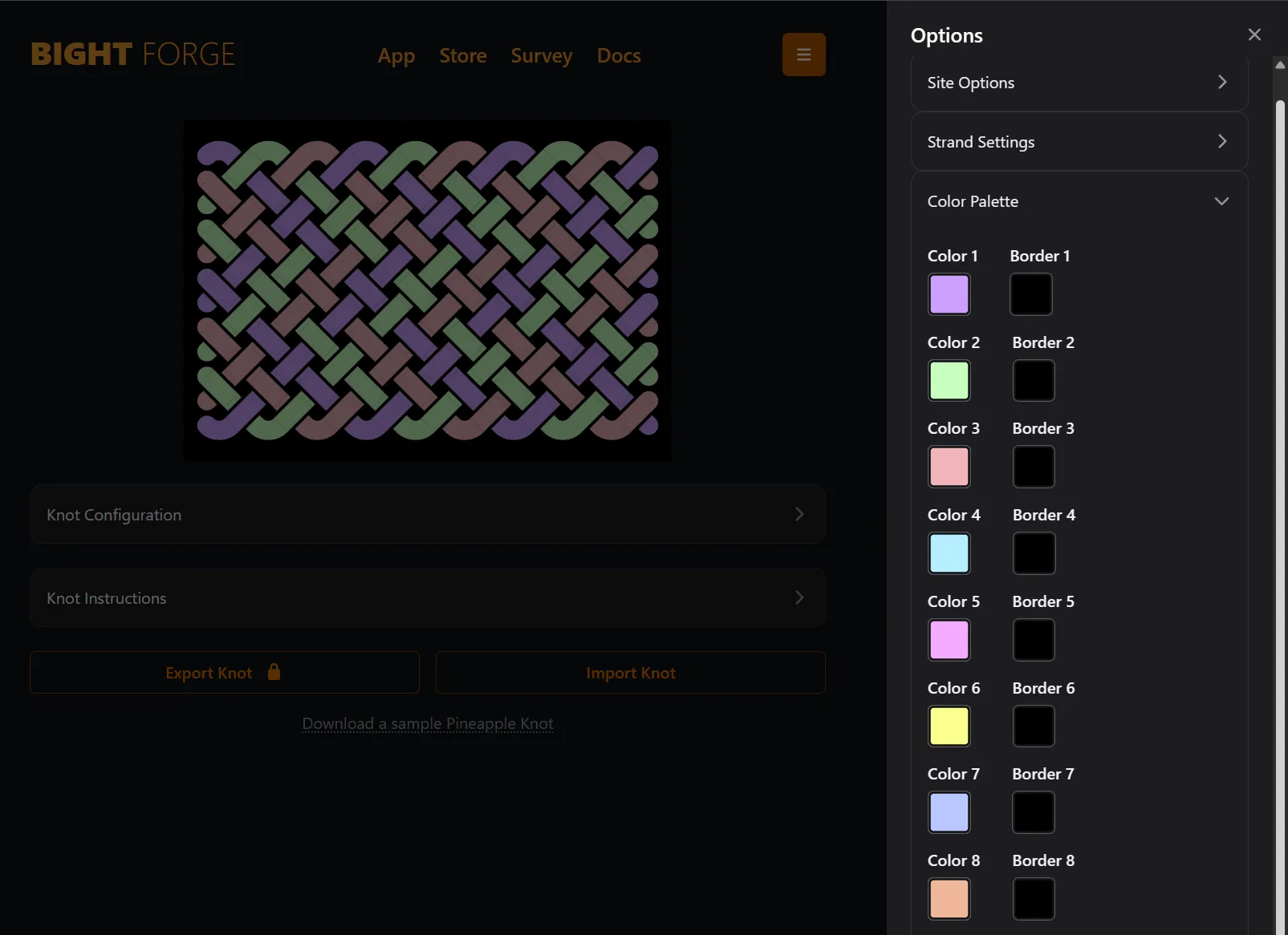 Bight Forge automatically assigns up to 8 unique colors to each strand in a knot. These can be adjusted via Options > Color Palette.