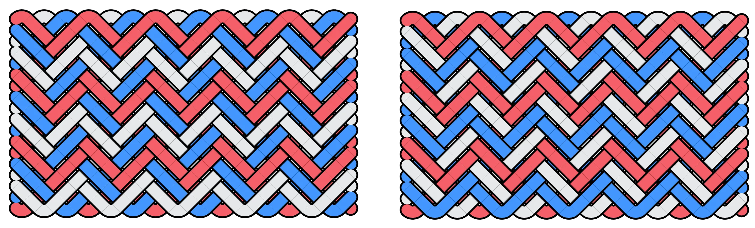Section titled “Color Order”The color order of strands can drastically change a knot’s appearance. Here, the image on the left is using red, white & blue, and the image on the right is using red, blue & white.