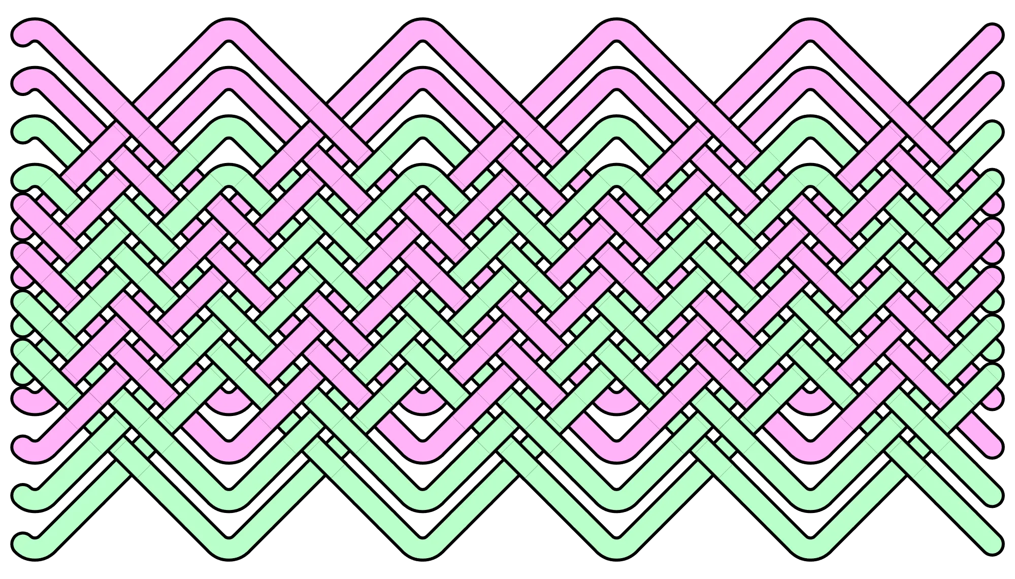 Section titled “Using the Same Color”Using the same color more than once can create some interesting patterns. This nested knot has 4 strands - 2 pink and 2 green. It is using OOUU Column Coding.