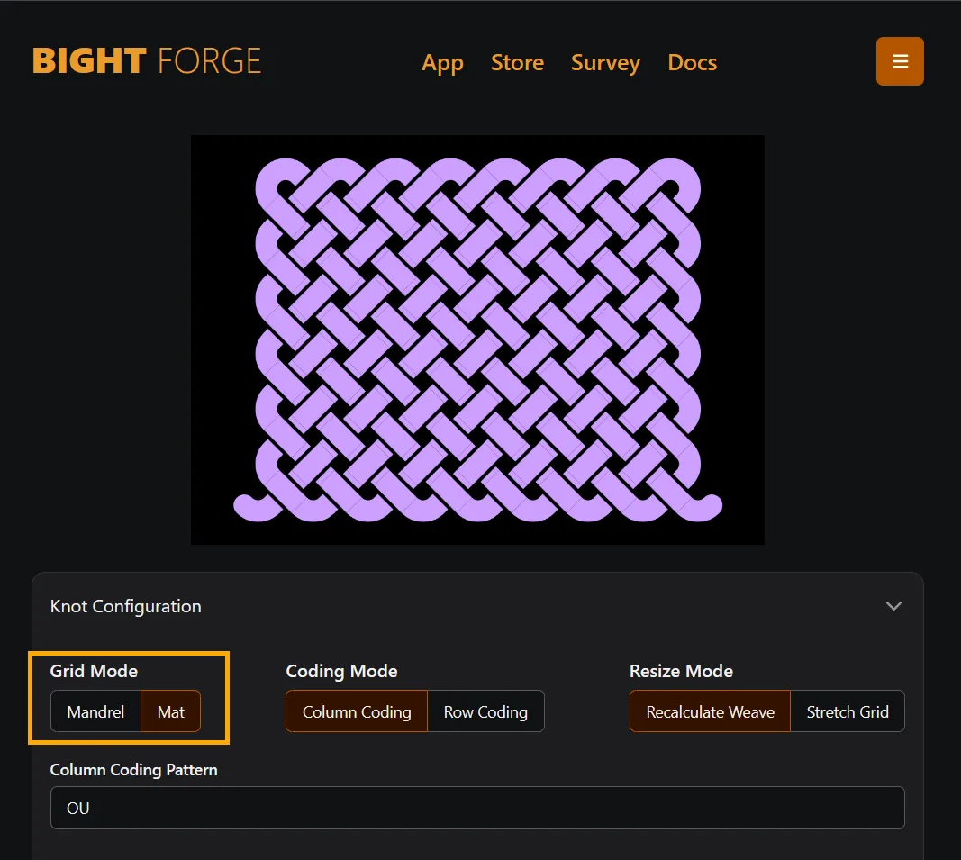 Bight Forge can generate knots tied on a mandrel or as a mat. Use the Grid Mode toggle to switch grids.
